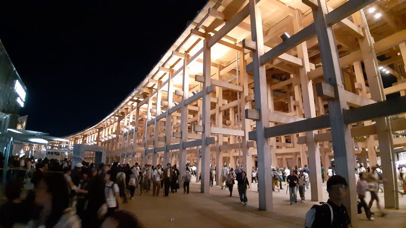 | 日本列島は奇蹟的に樹木が豊かに育つ地であり、人々はその豊かな樹木資源を活用することで産業を興し文化を築いてきました。しかし戦後の日本は内なる樹木資源を見捨て、石油など外なる資源に依存する社会を追求してきました。しかし近年、持続可能性が叫ばれ大きな曲がり角に来ています。 光り輝く大屋根リングは「そうだ、日本には樹木資源があったのだ。これを活用する社会を再構築すれば、豊かで平和な持続可能社会が実現できるぞ」との思いを人々に伝えている様に思われました。 |