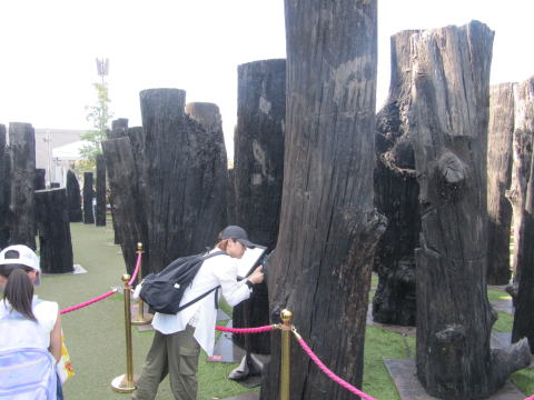 (178-4) 6500年前の樹木タイムカプセル 6500年前ころチェコ地域でオークの森が何らかの理由で地中に没し、亜化石になって近年発見され、133本のオーク亜化石が「文明の森」と名付けて左写真の様に展示されていました。 このようなオーク大木の亜化石は一本でも非常に貴重なものですが、それを130本余り集めて展示するのはまさに万国博覧会ならではの価値ある展示です。 6500年前というとチェコ地域で文明が芽生えた時期であり、その当時に人間と共に文明を築いていたオークの木が、6500年後にタイムカプセルの様に人間の前に出現したことから、「文明の森」と名付けられたのでしょう。 オークの木と伴にチェコ地域の文明を築いて来たことを大切に思うチェコの人々の、樹木に対する深い愛と感謝の念が表れています。 |