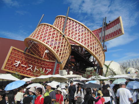(178-5) 音楽と林業を象徴するオーストリア館の木造オブジェ オーストリア館では巨大なリボンをくるくると丸めたような木製のオブジェが目立ちました。リボンには5本の線が引かれており、これが音楽の五線譜を表し、オーストリアが豊かな音楽を育む国であることを表している様でした。 オーストリアは古くから身近に豊かに育つ樹木資源を活用する林業国ですが、戦後においても基盤産業としての林業を守り、新しい木造建築技術を開発し、世界に先駆けて木造ビルを実現しています。 オーストリアは音楽だけでなく、豊かな樹木資源を活用する林業国家であることを、このオブジェは表しています。 |