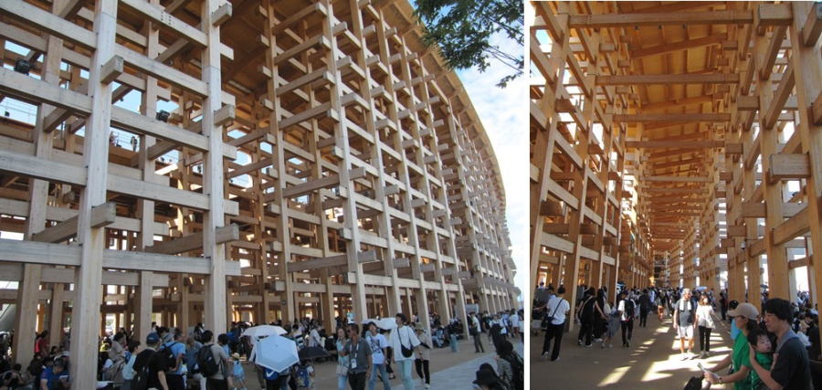 | 大屋根リングは日本の伝統的な木造建築方式に、オーストリアなどで開発された新しい木造建築技術を加えて実現されました。 大屋根リングの中に入ると、上右写真の様に木造建築物の安らぎの空間が広がっていました。 |