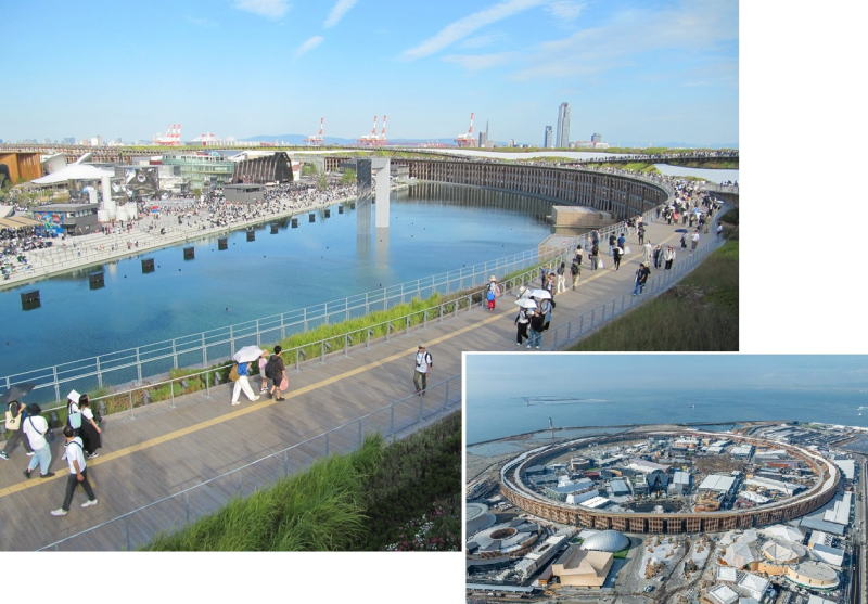 | (178-2) 雄大な大屋根リング 大屋根リングの上に上がって見ると、リングは万博会場をぐるりと取り囲み、一部は海上にまで伸び、その壮大さに驚かされます。そしてそのすべてが木で作られていることを思うと感動せずにはおれません。 (下写真の右下の小写真は万博公式HPより) |